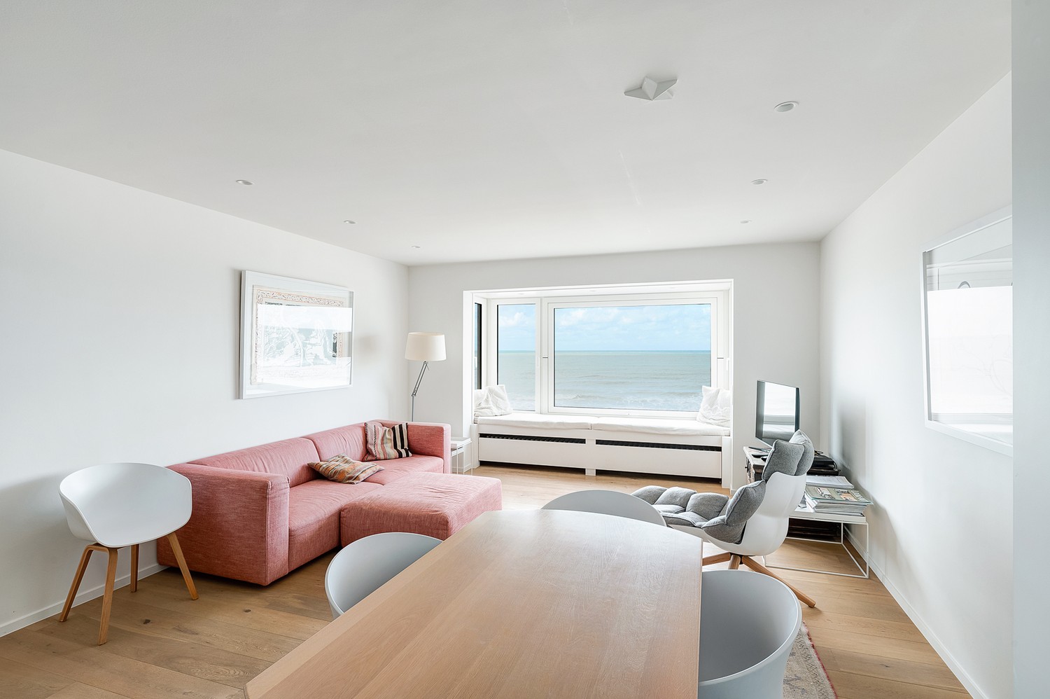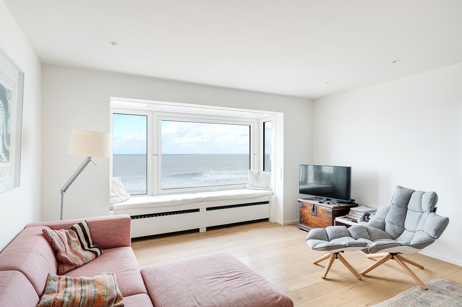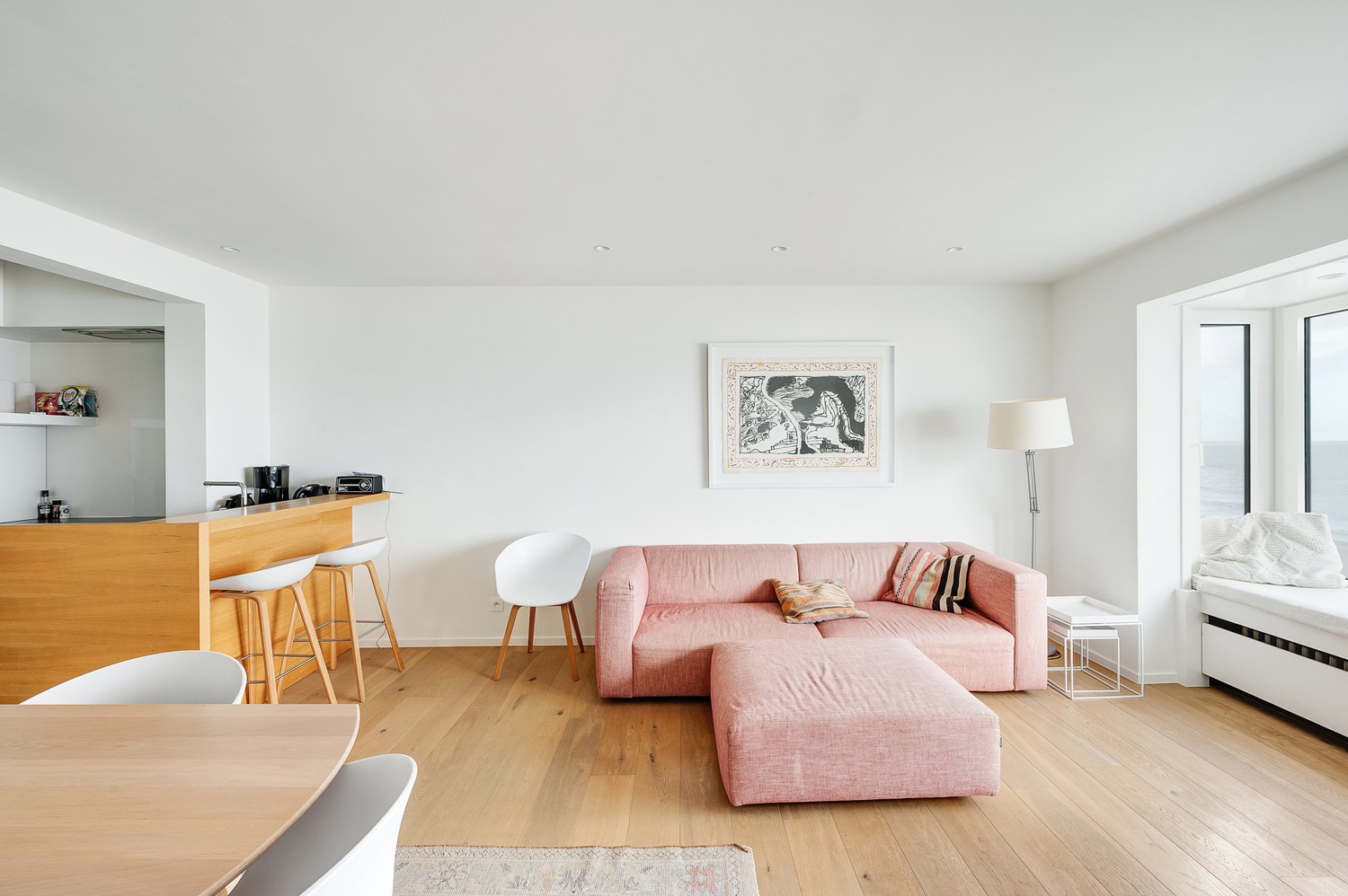 Le spacieux salon avec parquet et armoires sur mesure est baigné de lumière et offre une magnifique vue frontale sur la mer, presque sur toute la largeur de la pièce ! Le salon confortable avec canapé fixe est relié à la cuisine ouverte entièrement équipée avec plan de travail en pierre naturelle et appareils électroménagers de qualité. La salle à manger est attenante, ce qui crée une atmosphère agréable et ouverte.