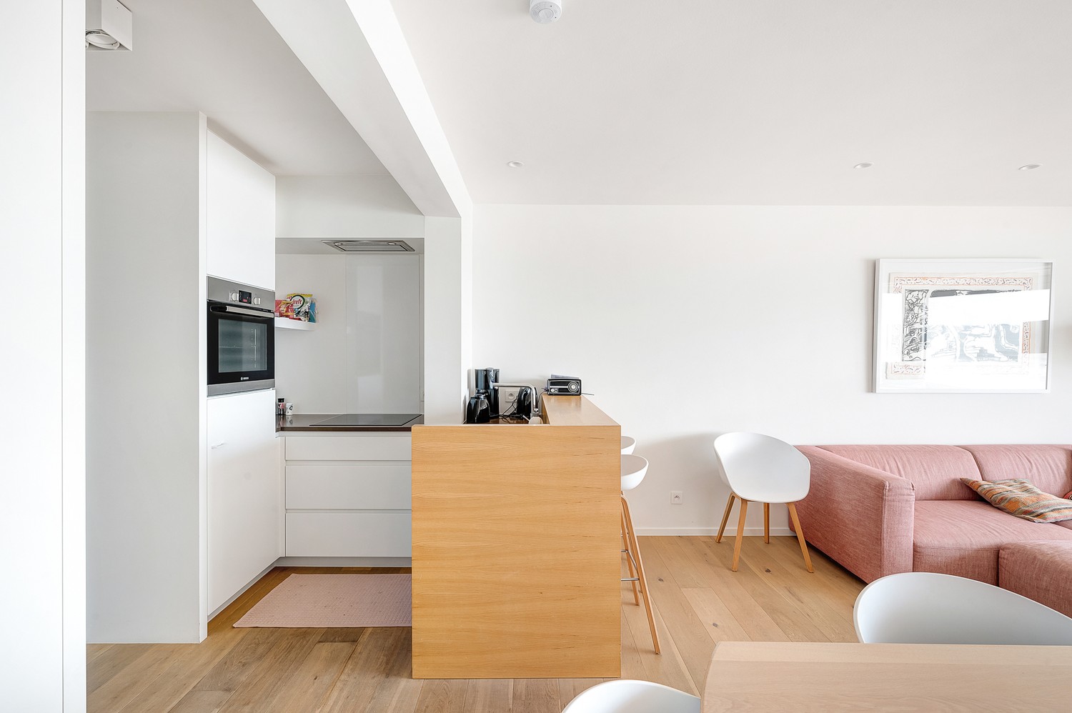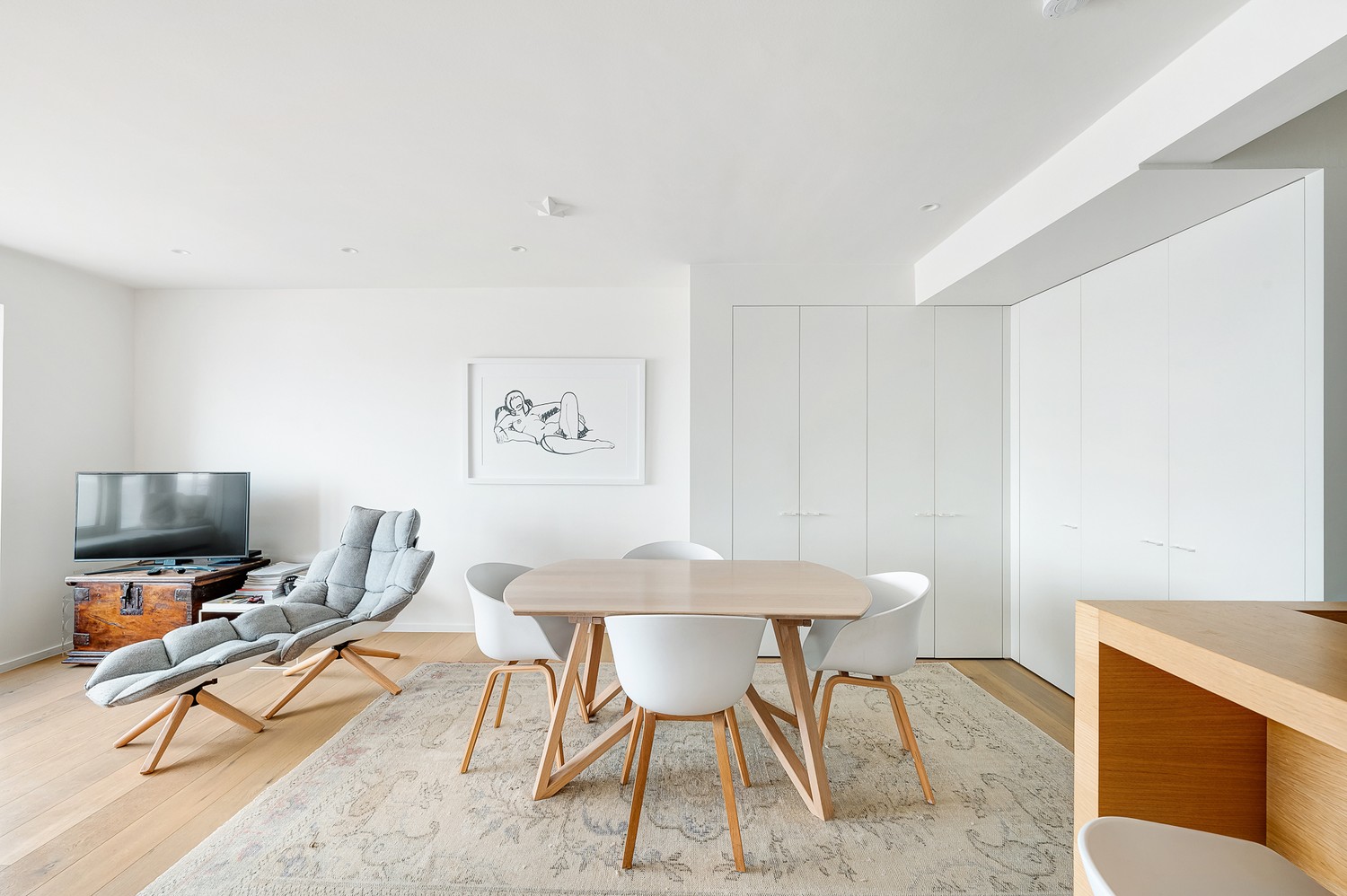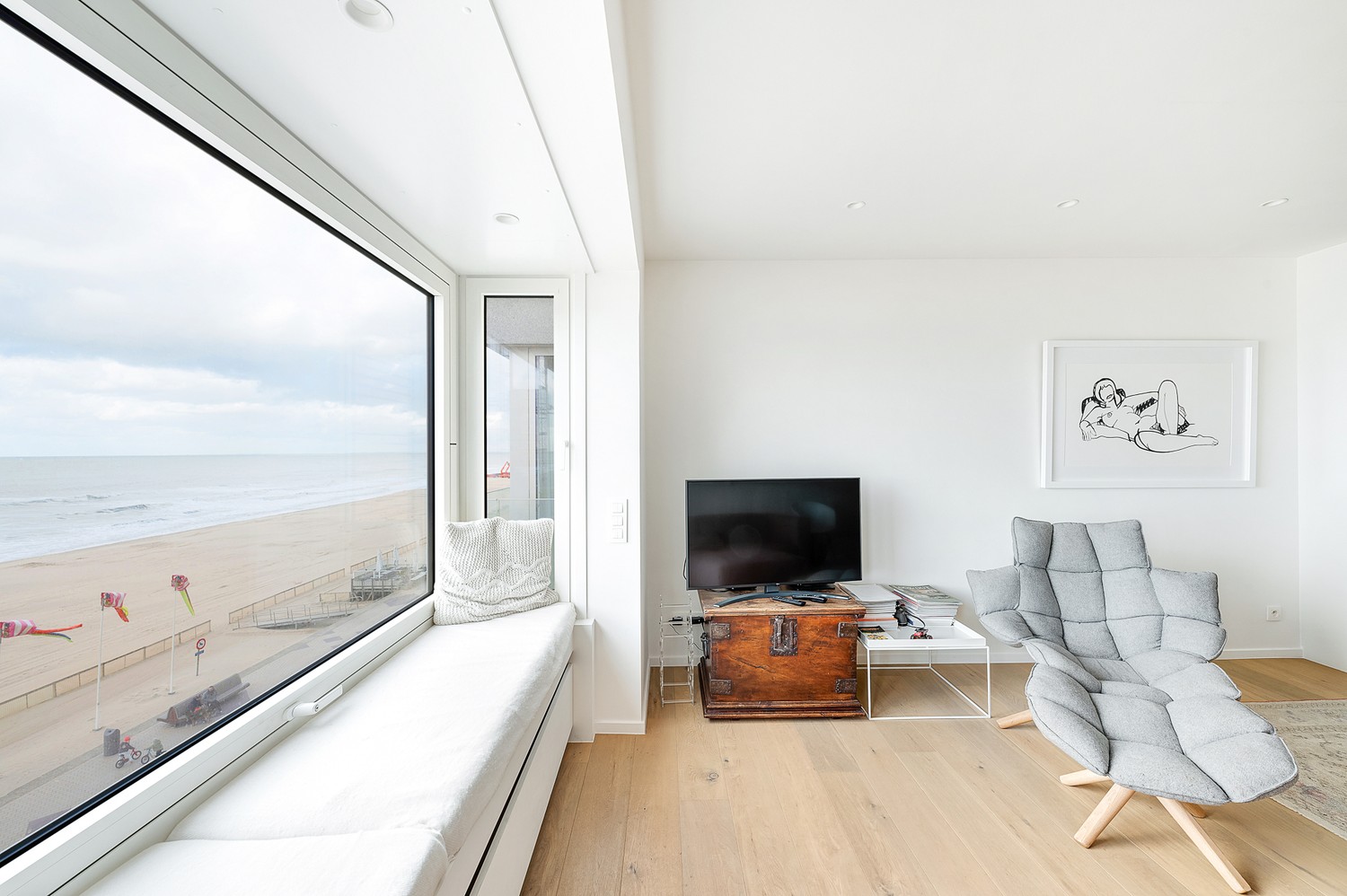 Le spacieux salon avec parquet et armoires sur mesure est baigné de lumière et offre une magnifique vue frontale sur la mer, presque sur toute la largeur de la pièce ! Le salon confortable avec canapé fixe est relié à la cuisine ouverte entièrement équipée avec plan de travail en pierre naturelle et appareils électroménagers de qualité. La salle à manger est attenante, ce qui crée une atmosphère agréable et ouverte.