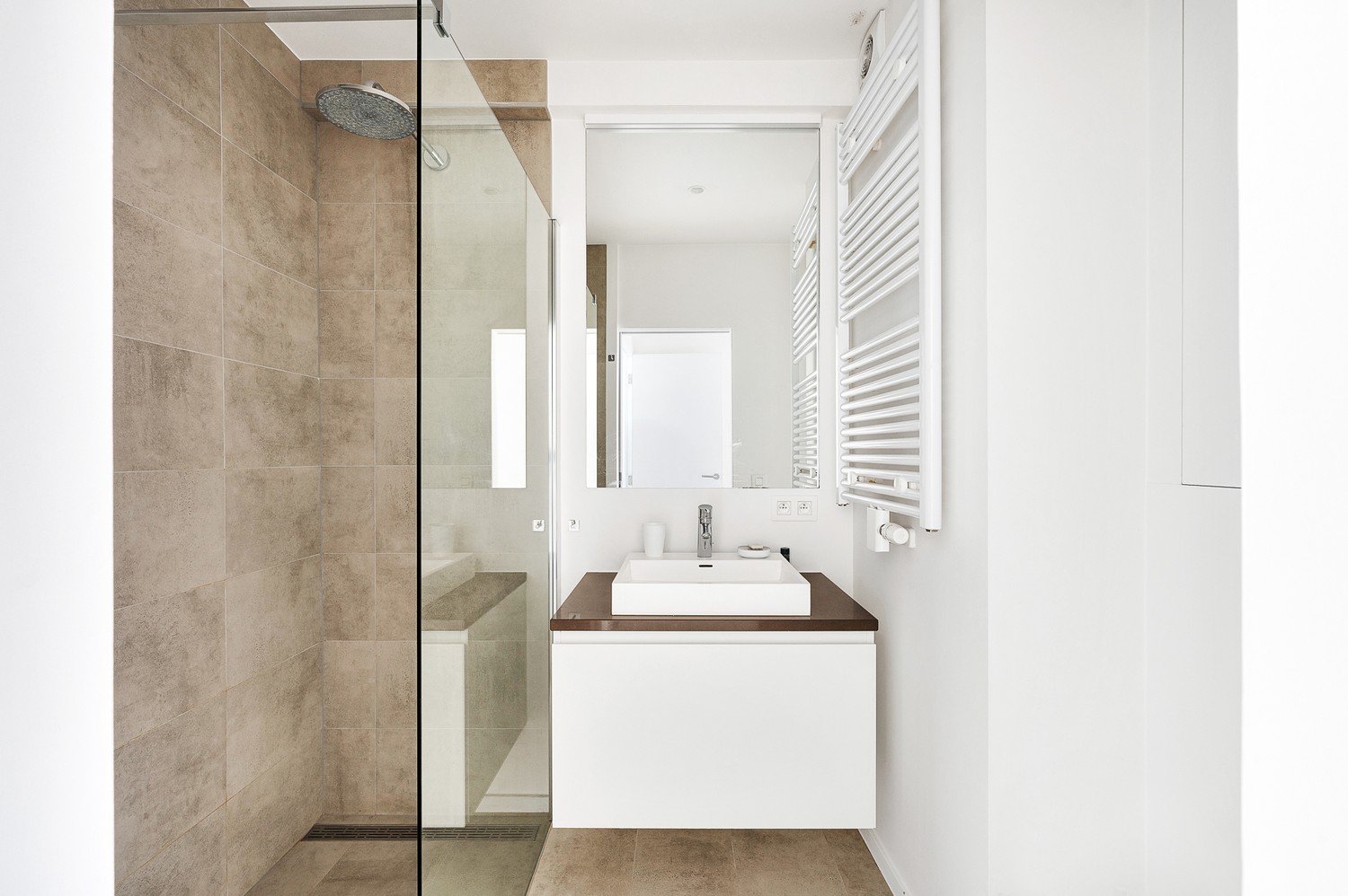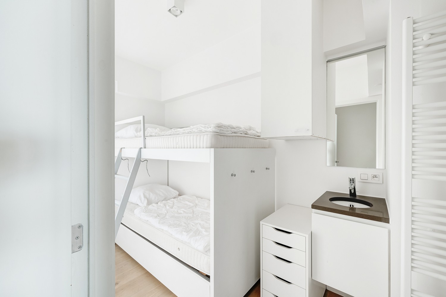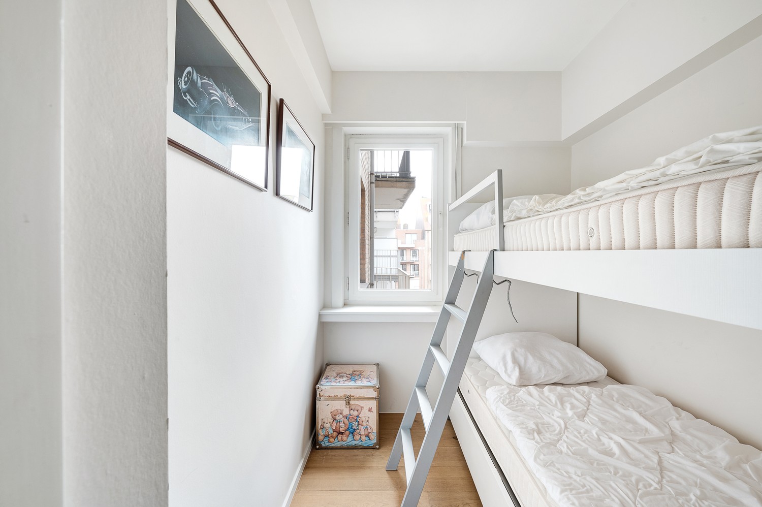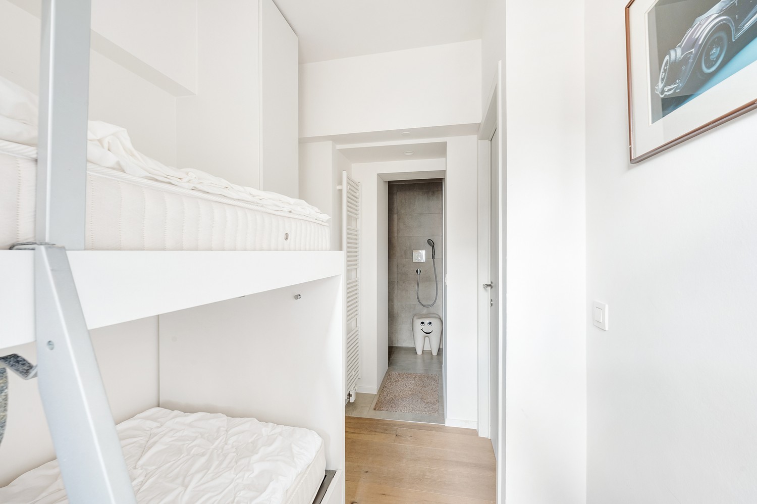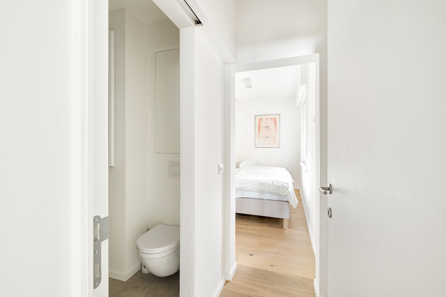 L'appartement dispose d'une chambre principale spacieuse avec placards intégrés et salle de douche privée, ainsi que d'une deuxième chambre d'enfant avec lavabo et accès à une salle de douche privée avec douche à l'italienne. À l'entrée se trouve un WC séparé pour les invités.
