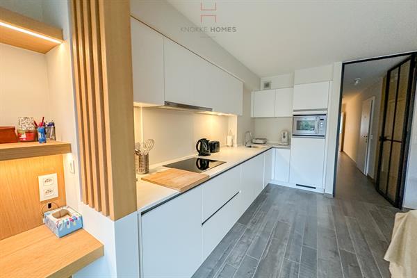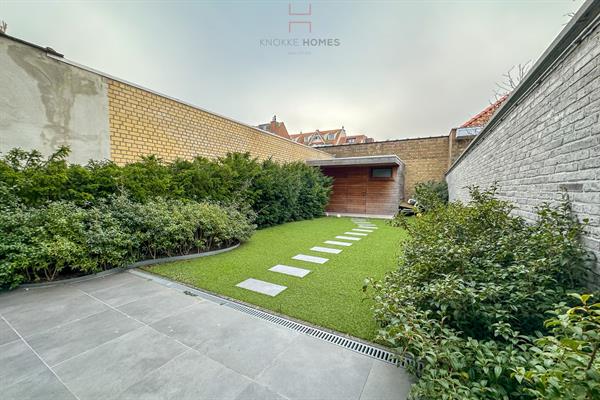 Knokke - Van Bunnenlaan. Jeune appartement avec jardin privé, finition de bon goût et de qualité, entièrement meublé. Disposition : hall d'entrée avec des armoires sur mesure. Toilettes d'invités séparées. Bel espace de vie (parquet en céramique) avec coin repas et salon confortable (placards sur mesure), donnant par de grandes baies vitrées sur la terrasse et le jardin facile d'entretien avec abri de jardin. Cuisine ouverte et entièrement équipée avec tous les appareils nécessaires (AEG). Coin bureau sur mesure avec éclairage indirect. Pièce de rangement pratique avec congélateur supplémentaire et lave-linge (Siemens). A l'avant, une grande chambre à coucher avec un lit double et de nombreuses armoires encastrées. Salle de bain séparée avec double lavabo et douche à l'italienne. Coin nuit astucieusement aménagé avec lit sur mesure et espace de rangement supplémentaire. A l'extérieur : grande terrasse semi-couverte équipée d'un store (orientation sud-sud-ouest) avec jardin attenant (gazon artificiel) et un grand abri de jardin pratique pour ranger les meubles de jardin et les accessoires. L'appartement bénéficie de finitions de haute qualité et est accompagné d'une grande cave privée. Local à vélos partagé au sous-sol (2 vélos par appartement) + possibilité de placer les vélos dans le jardin avant. Compteurs privés, chauffage central au gaz naturel, vidéophone, porte de sécurité en acier avec serrure multipoints, espion, store automatisé, ... souci du détail et du confort. L'offre comprend tous les meubles, l'éclairage, la télévision, le mobilier de jardin, etc... prêt à l'emploi ou à la location. Seulement 1 unité résidentielle par étage. Appartement libre de bail / reconnu comme maison de vacances - libre par acte notarié.