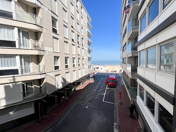 Mooi appartement met twee slaapkamers en zijdelings zeezicht in het Zoute. Bij dit appartement hoort een garagebox aan het gemeenteplein.