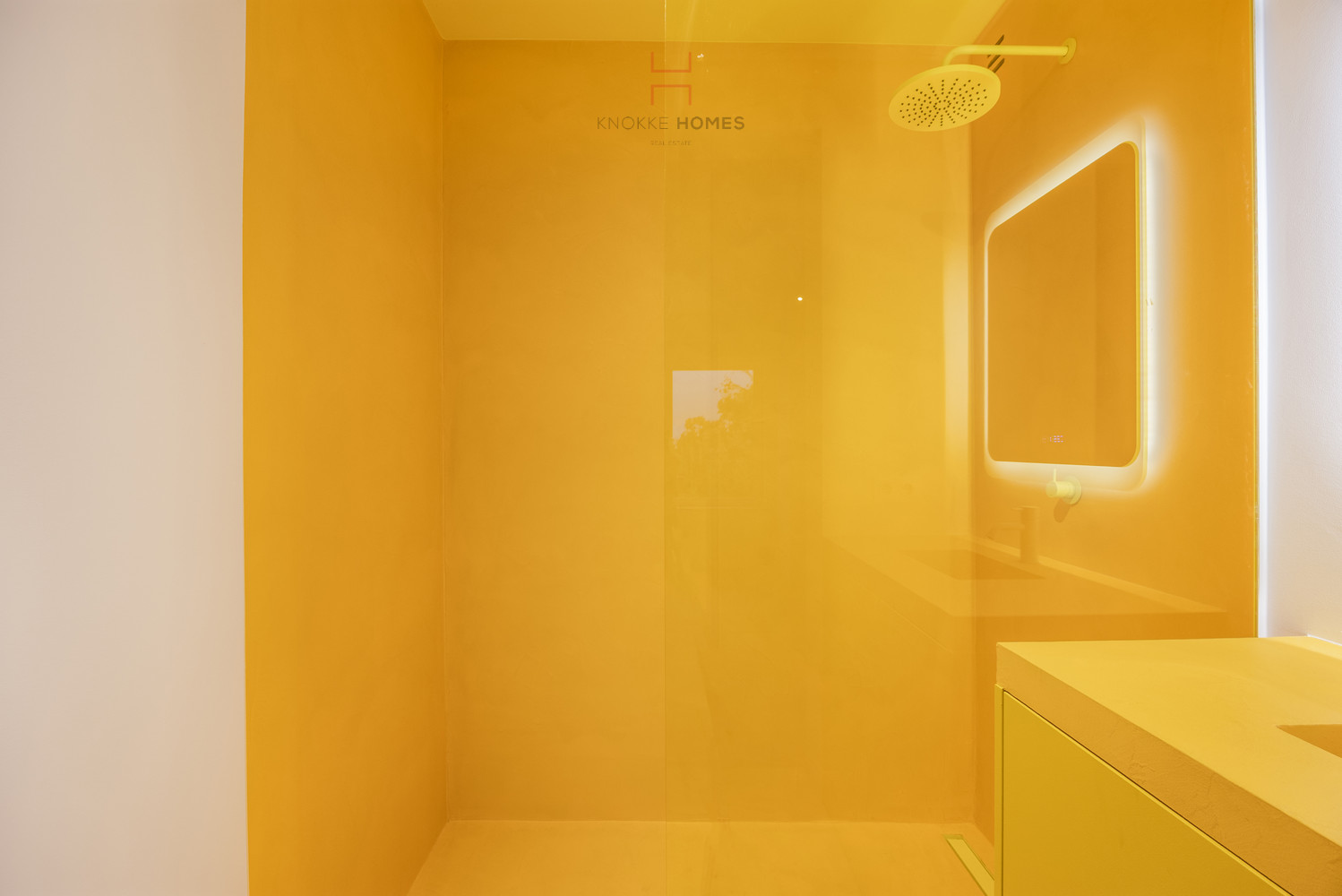De woonkamer baadt in het licht en vormt samen met de open, volledig uitgeruste keuken een uitnodigende leefruimte. Het keukenblad in microcement sluit naadloos aan bij het hedendaagse karakter van het appartement. Een apart gastentoilet zorgt voor extra comfort. De hoofdslaapkamer beschikt over ingemaakte kasten en een privatieve doucheruimte, terwijl de tweede slaapkamer, ook geschikt voor een dubbel bed, eveneens werd voorzien van een eigen doucheruimte. Beide badkamers zijn afgewerkt in opvallend geel microcement, een gedurfde keuze die het appartement een uitgesproken en uniek karakter geeft. Elektrische vloerverwarming, ledverlichting, spiegels met klok en anti-aandampfunctie, wit sanitair en hoogwaardige schilderwerken versterken het verfijnde wooncomfort. Er is geen lift en geen syndicus, waardoor de kosten bijzonder laag zijn.