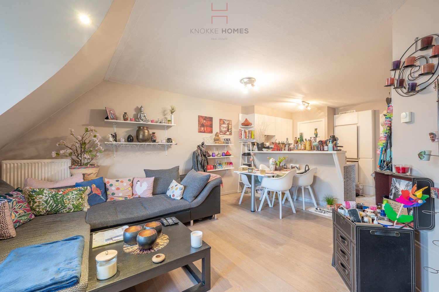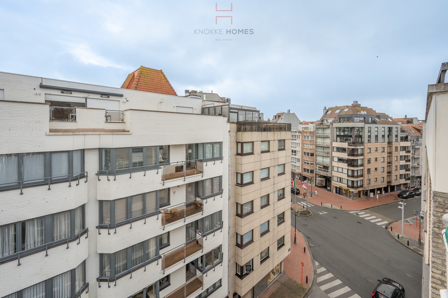 Knokke centrum - Zoutelaan. 5de verdieping. Lift. Indeling: verdieping 05: inkom. Mooie open leefruimte met vooraan grote zuidgerichte deurvensters uitgevend op terras van waaruit aangenaam zicht op o.a. de Lippenslaan en de Zoutelaan. Trap naar verdieping 06. Open keuken ingericht met o.a. elektrische kookbekkens, dubbel spoeltafel, oven, koelkast en dampkap. Afzonderlijk gastentoilet. Achteraan slaapkamer 1 met bijhorende douchekamer. Toegang tot terrasje achteraan vanuit de eerste slaapkamer. De 2de slaapkamer op verdieping 06 is bijzonder ruim en voorzien van een hoekbad.