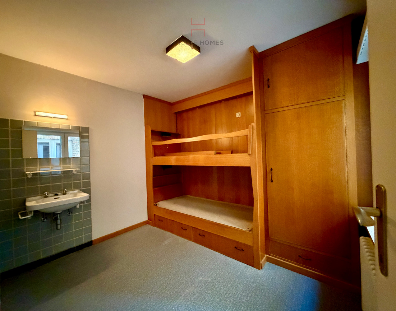Indeling: inkomhal met vestiairekast en een apart gastentoilet. De lichtrijke leefruimte biedt een adembenemend, frontaal zicht op zee. Aansluitend bevindt zich de keuken. Het appartement beschikt over vier volwaardige slaapkamers. Twee kamers zijn ingericht met stapelbedden, terwijl de andere twee plaats bieden voor een dubbel bed en toegang hebben tot het terras aan de achterzijde. Alle slaapkamers zijn uitgerust met ingemaakte kasten. Verder is er een badkamer met ligbad, toilet en dubbele lavabo, aangevuld met een aparte douchekamer. De syndickosten zijn inbegrepen in de huurprijs. Het appartement wordt uitsluitend verhuurd als tweede verblijf (+ tweedeverblijftaks). Er is een privatieve kelderberging en een gemeenschappelijke fietsenberging aanwezig.